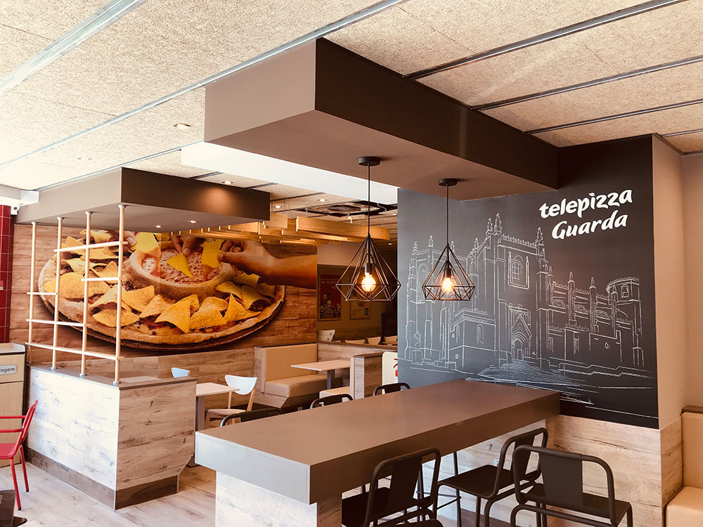 Telepizza GuardaPersonalização de ponto de venda. Impressão digital, Grafismos recortados em CNC, aplicações em vinil fosco recortado. Related
